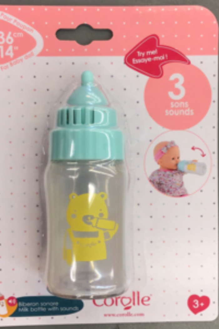 Age 3+ years. Magic baby bottle for 14” Baby Dolls. 3 Sounds