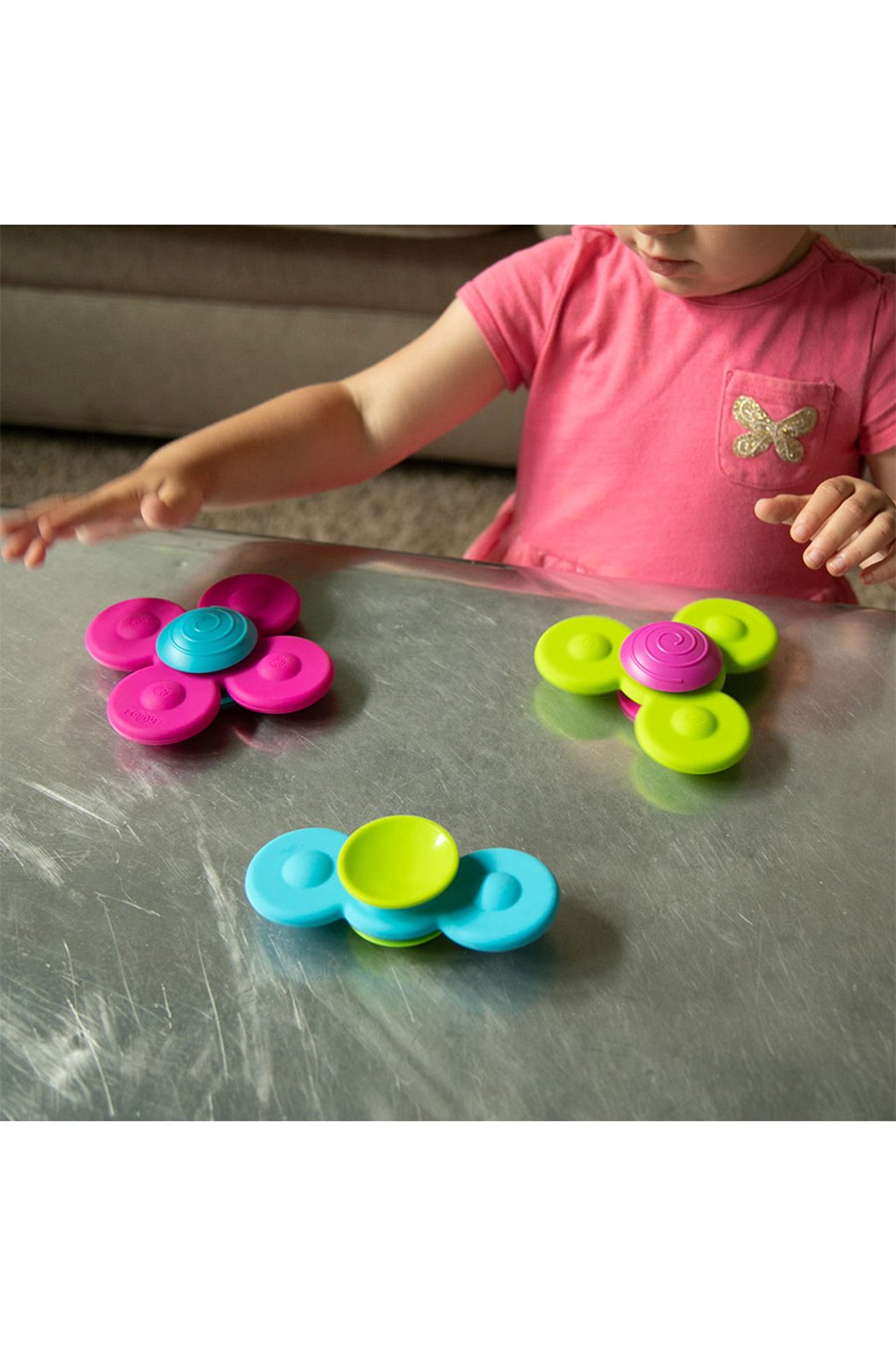 Send your little explorer twirling and whirling into a delightful sensory adventure! Each Whirly Squigz is made of 100% high quality silicone that's colorful, pleasant to touch, and safe for teething. Hold them, explore their unique contours, chomp on them and let them soothe sore gums... Then, stick them to any smooth, flat, non-porous surface - like a bathtub wall, a tabletop, or a window - give them a spin, and... WHOOSH! - Around and around they go, faster than the eye can see! Sensory exploration spins in a new direction with Whirly Squigz. Whirly Squigz - 2018 Set of 3 colorful silicone spinners Encourages fine motor skills, sensory exploration, cause-effect learning A mesmerizing experience for the hands and eyes Spinners made of 100% high quality, food-grade silicone - Perfect for teething Each features a suction cup on one side, swirl-textured dome on the other Sticks to any smooth, flat, non-porous surface Spin wonderfully smooth and fast Bearings made of high quality plastic - Won't rust or degrade in the tub Includes 3 Whirly Squigz - One with 2 propellers, one with 3, and one with 4 BPA-Free, fully safety tested High quality design and materials - Lasting durability and safety