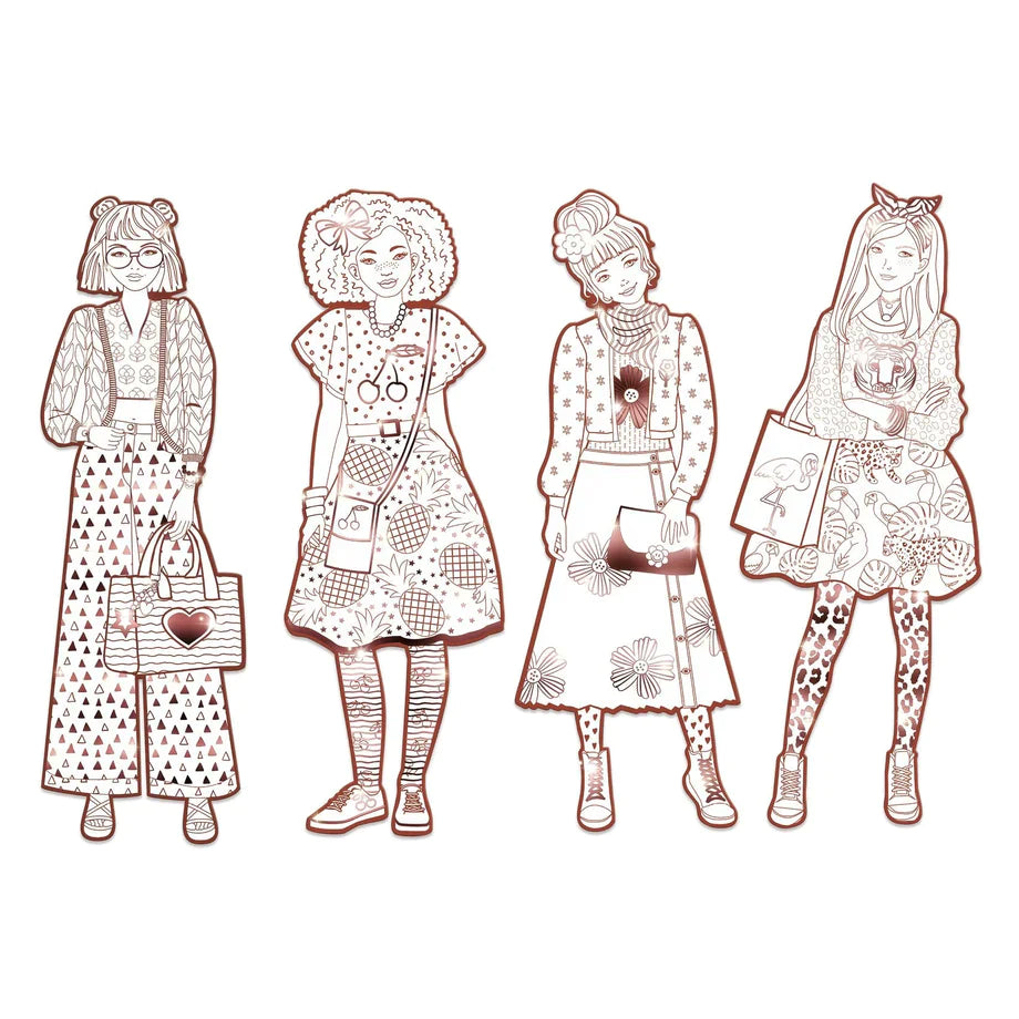 A parade of girls wearing colorful outfits for you to color in however you'd like! Four large outlines offer outfits covered in patterns and adorned with metallic areas to make the models look even better!