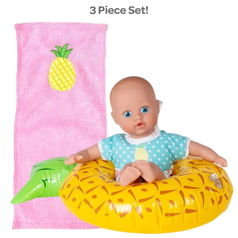 She has an irresistibly cute 8.5” baby doll with a soft and cuddly body and fresh baby powder-scented vinyl. This water doll is perfect for bath time fun and even comes with a pink bath towel embroidered with a colorful pineapple print, and a blow-up pineapple floatie for extra playtime excitement.