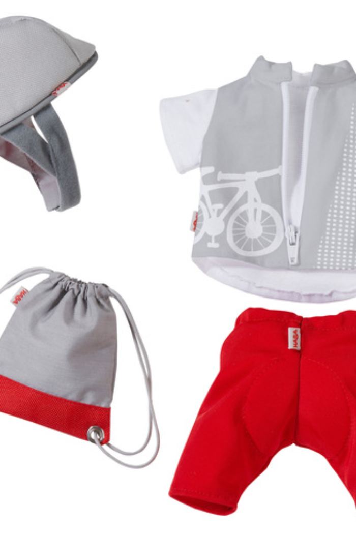 What could be more enjoyable than a bike ride through town and into the country? With the Bike Time dress set, HABA dolls are fashionably attired for an outing on two wheels. Contents include: red leggings, bike themed shirt with zipper, bicycle helmet with hook and loop fastener and matching backpack.
