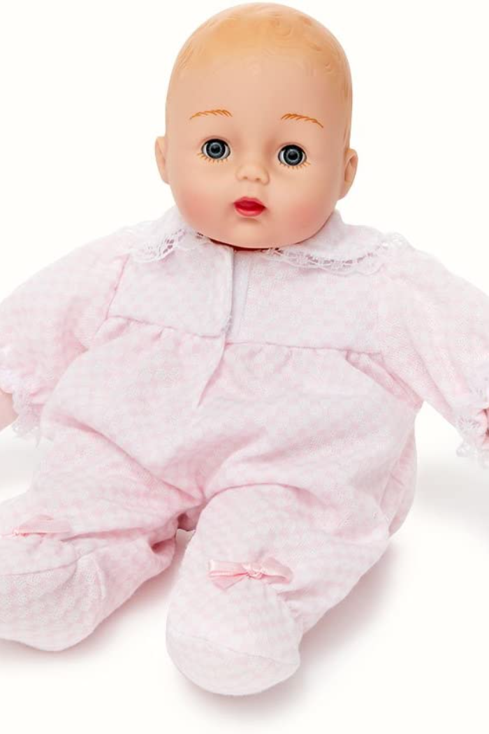 Details: Wears a pink and white checked knit onesie with long sleeves, footed feet with pink ribbon and lace trim accents; Features blue eyes and light brown painted hair