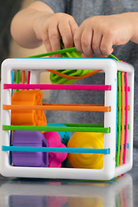 An incredibly unique shape-exploration experience! It's beautifully simple and amazingly mind-expanding! The six chunky shape blocks are each designed with fascinating textures that are sure to thrill the fingers. There's a cube, a diamond, a sphere, a triangle, a flower, and the happy Fat Brain logo. As kids push the shapes through the elastic bands of the cube, a curiosity is sparked and young minds can't help but explore, experiment, and discover. Ages 10 months +