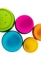 The top of each cup features a squishy silicone bubble embossed with a unique texture pattern. Little fingers will love to touch, push, and pop them again and again.