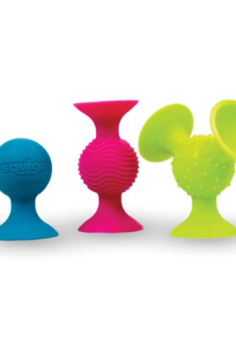 Includes 3 pipSquigz - 1-suction-cup, 2-suction-cup, 3-suction-cup. Made of high-quality silicone. Easy to clean and dishwasher safe. BPA-free, safe as a teething toy. Tested to the highest safety standards. The ultimate KEEP-THEIR-ATTENTION TOY for babies and toddlers. Encourages exploration & sensory awareness. Enhances vision, hearing, touch, movement. Innovative suction holds pipSquigz to smooth surfaces, no residue! Perfect for the stroller, highchair, bathtub, and anywhere-travel. Push pipSquigz down on any smooth surface, watch baby interact. Stimulate hearing: gentle rattles in each shape, "POP!" as pipSquigz separate. Stimulate touch: wavy ridges, bumps, debossed, smiling face. Stimulate vision: brilliant colors; lime, fuchsia, teal. Stimulate motor skills: Engage both small and large motor skills. Each shape can be tugged, pushed, shaken and pulled. Push and stick shapes together for new play experiences.