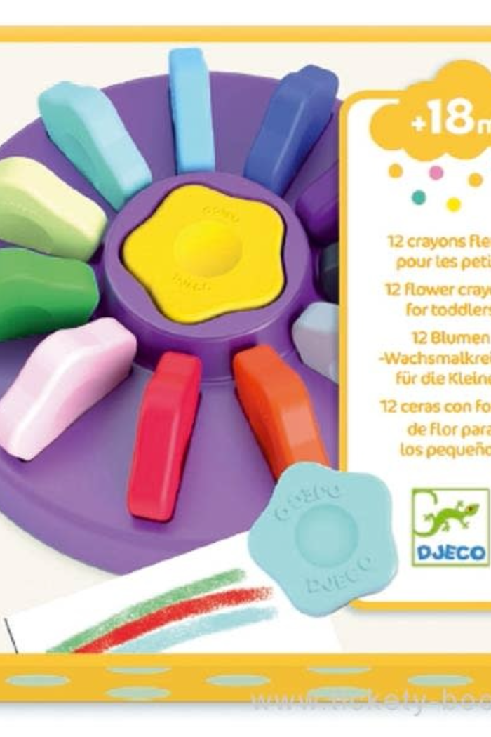 Age 18+ months. First Crayons. Easy to grip. Does not stain. 12 flower shape crayons with holding tray.