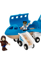 Age 3+ yrs. 5 pieces. Set includes blue airplane with a panel that opens up to place passengers, 2 poseable figures, a rolling stair case and suitcase.
