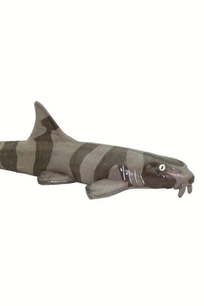 Characteristics: This accurate, detailed Bamboo Shark features the long, cylinder-shaped body the family is known for, with small barbels on its face and large spiracles (breathing holes) underneath the eyes. Its distinctive bars mark the figure as a juvenile, or young shark.