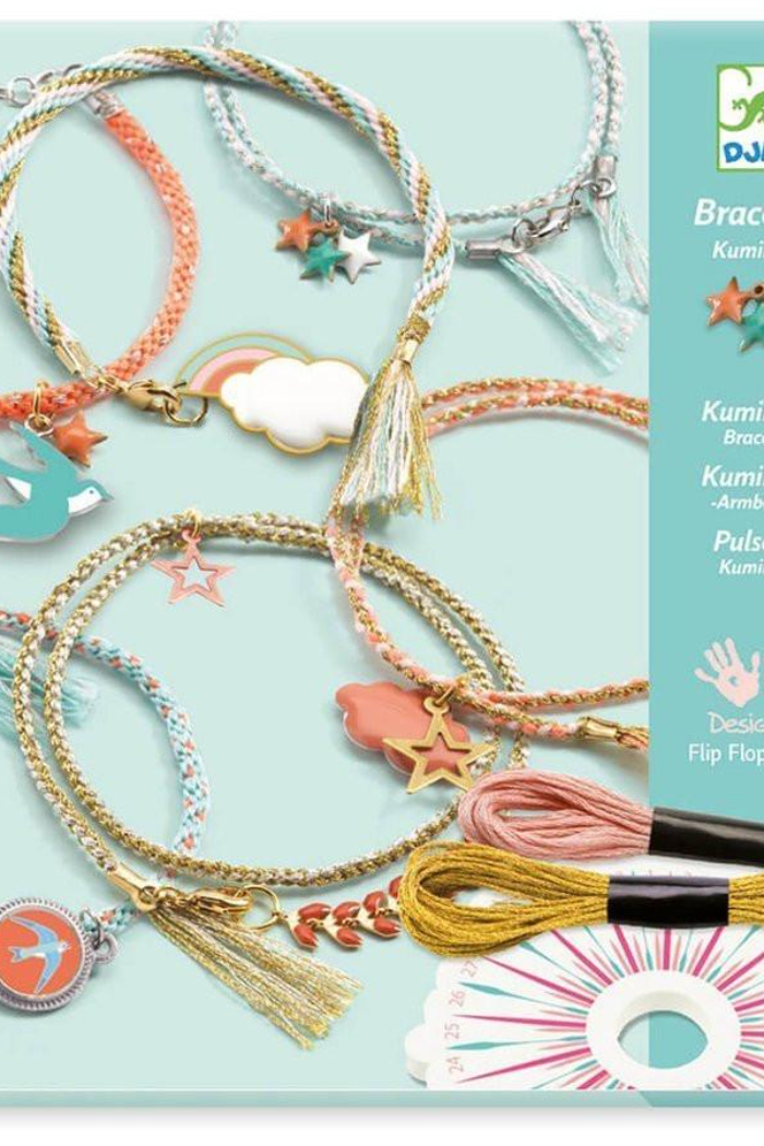 includes everything needed to make 4 elaborate bracelets; a weaving tool, 4 spools of thread, 6 embellishments, closure clasps, a pair of jewelry making pliers and an illustrated instruction book