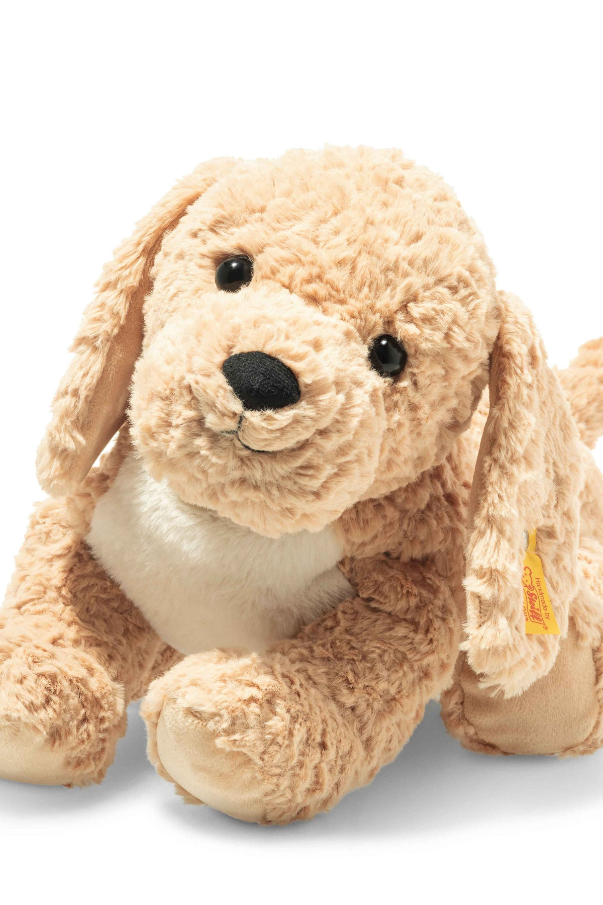 The Berno Goldendoodle Dog plush from Steiff is bound to become a child’s round-the-clock companion for play time, nap time and everything in between. This whimsical little pup is an adorable mix of a golden retriever and a poodle. The sweet details bring this breed to life, including a cuddly coat, glistening black eyes, and adorably floppy ears. Even his stitched mouth looks like a smile, showing just how happy he is to become a constant companion for a loving kiddo. Because it’s fully machine washable, this stuffed Goldendoodle can be played with inside or outside without worrying about cleanup afterward. This darling little dog measures 10 inches and has a super-soft feel that is perfect for hugs and cuddles, and the safety eyes are completely kid-friendly. The finishing touch is a signature stainless-steel Steiff "Button in Ear" tag that identifies the exceptional quality of this Goldendoodle stuffed animal.