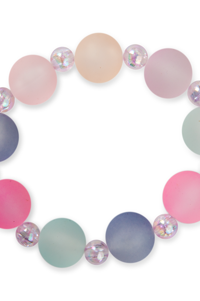 This bracelet is adorned with assorted pastel pearls each with a smaller sized crystal colored pearl between them.