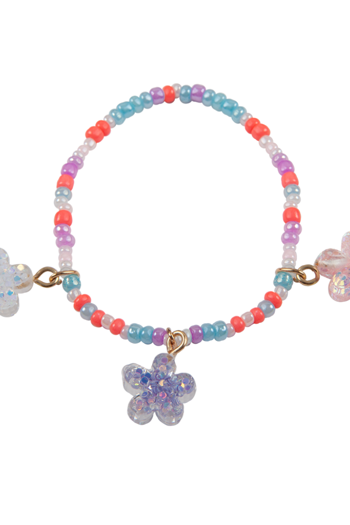 This whimsical brightly colored bracelet comes with three flower charms evenly spaced around its width. The whole bracelet is decorated with colorful rounded beads invoking the liveliness of Spring.