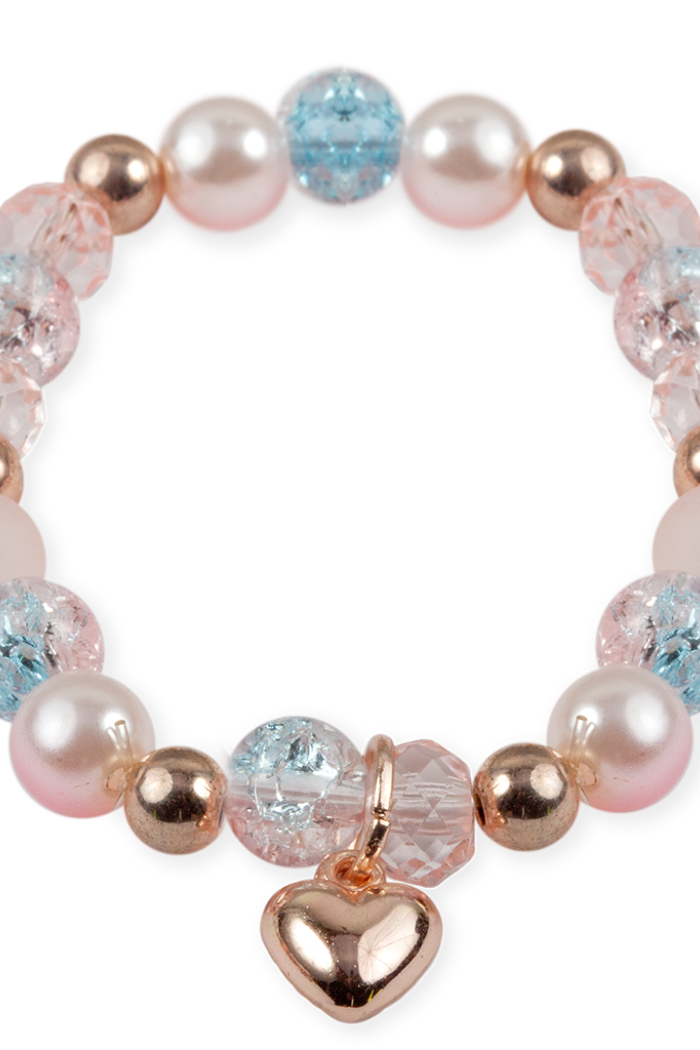 This keepsake is perfect for birthdays, parent child outings, or Valentine's day! Decorated with crystal, rose gold, and pink pearl colored beads the strand is topped off with a rose gold heart charm to express affection to your special one.