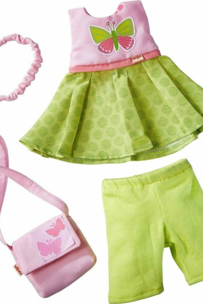 Your HABA doll will be looking cute for springtime with this bright dress set. From it's butterfly accents to its cheerful pink and green coloring, it is sure to be a doll-closet essential. The elastic headband actually pushes the doll's hair back! Let your doll stand out in this beautiful dress set!
