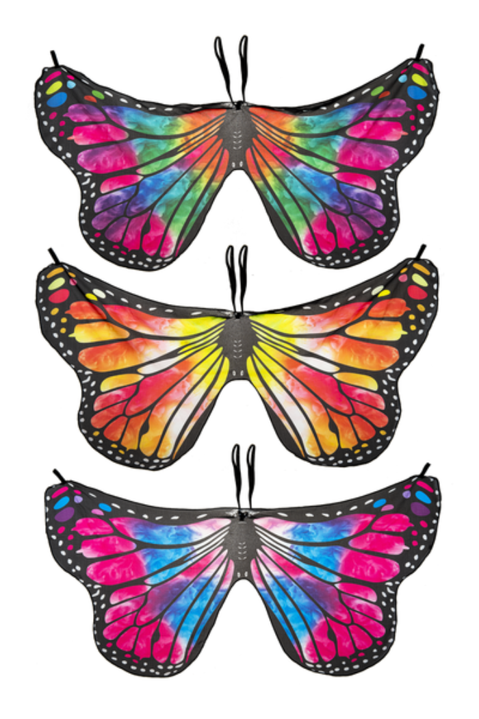 Three different butterfly wing patterns available: Blue/Purple, Yellow/Red/Orange, and Rainbow.