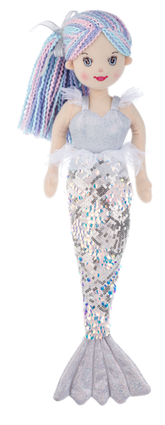 Cascade the mermaid from Shimmer Cove is thrilled to take your loved one on an adventure through the marine ecosystem. She has blue stitched eyes and hair that is blue-pink-purple throughout. Wearing a silver top to match her tail she is ready to plunge beneath the surf.