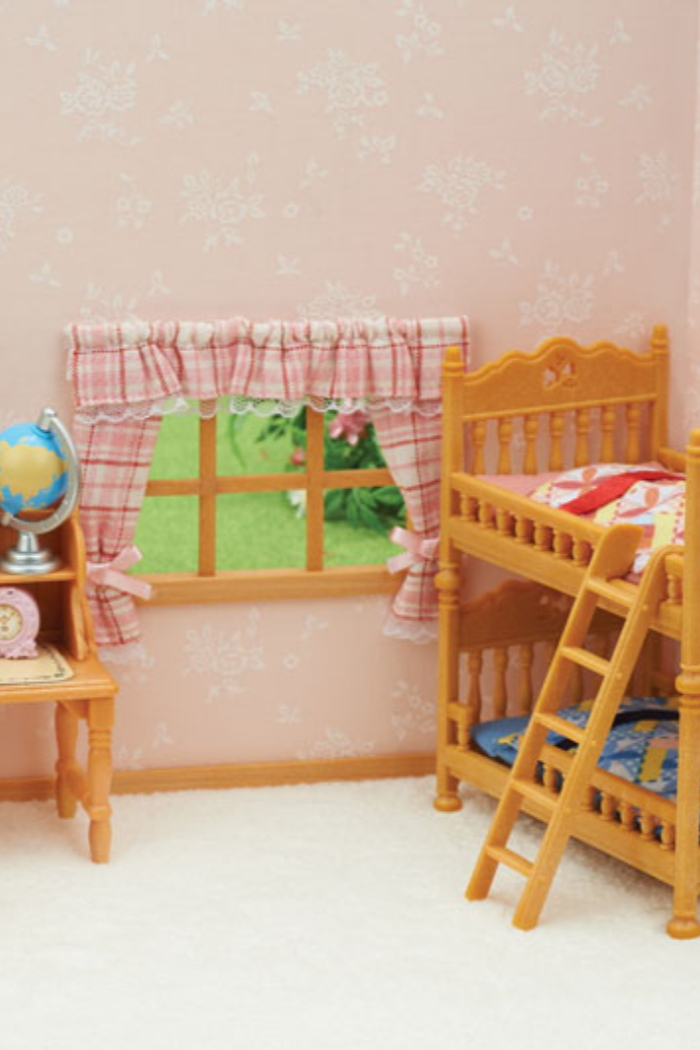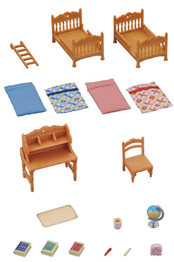 Age 3+ yrs. Set includes over 15 pieces: 2 single beds that are stackable to create bunk beds, ladder, desk, chair, globe, clock, 2 mattresses and 2 comforters lots more!