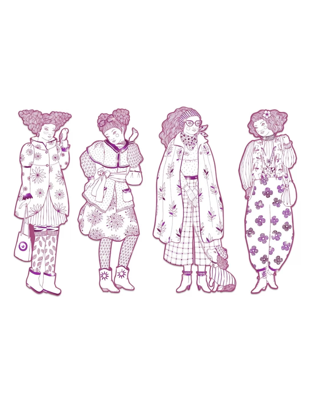 A parade of girls wearing colorful outfits for you to color in however you'd like! Four large outlines offer outfits covered in patterns and adorned with metallic areas to make the models look even better!