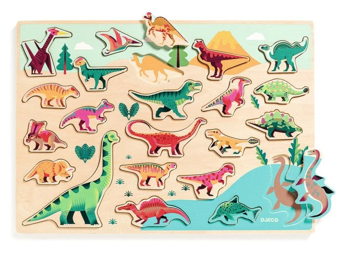 Piece together this playful dino-themed wooden puzzle by matching the 22 shapes and colors to their spots on the board.