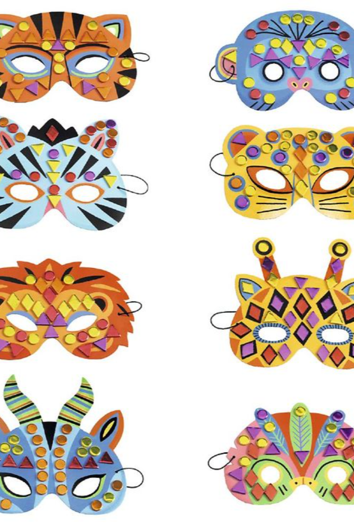 The Djeco masks are decorated with the included self-adhesive mosaics, and can then be used for playing with and role-playing games.