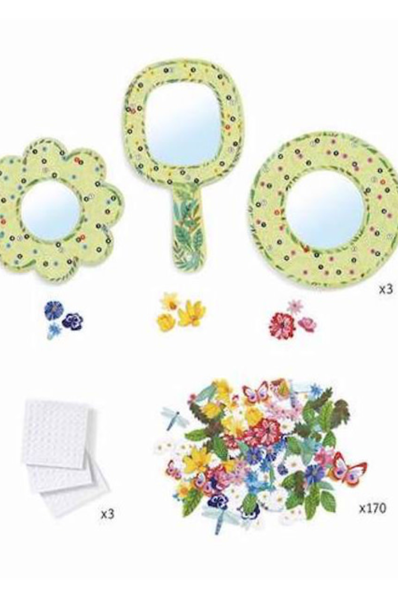 3 acrylic mirrors to decorate using overlaid paper flowers. Overlay the leaves and flowers around the mirror using the foam stickers provided, giving volume to the creation and making them look like a wreath of flowers. The acrylic mirrors are harmless if they break. Includes 3 mirrors, 3 sheets of foam stickers and 170 flowers, leaves and insects to decorate with.