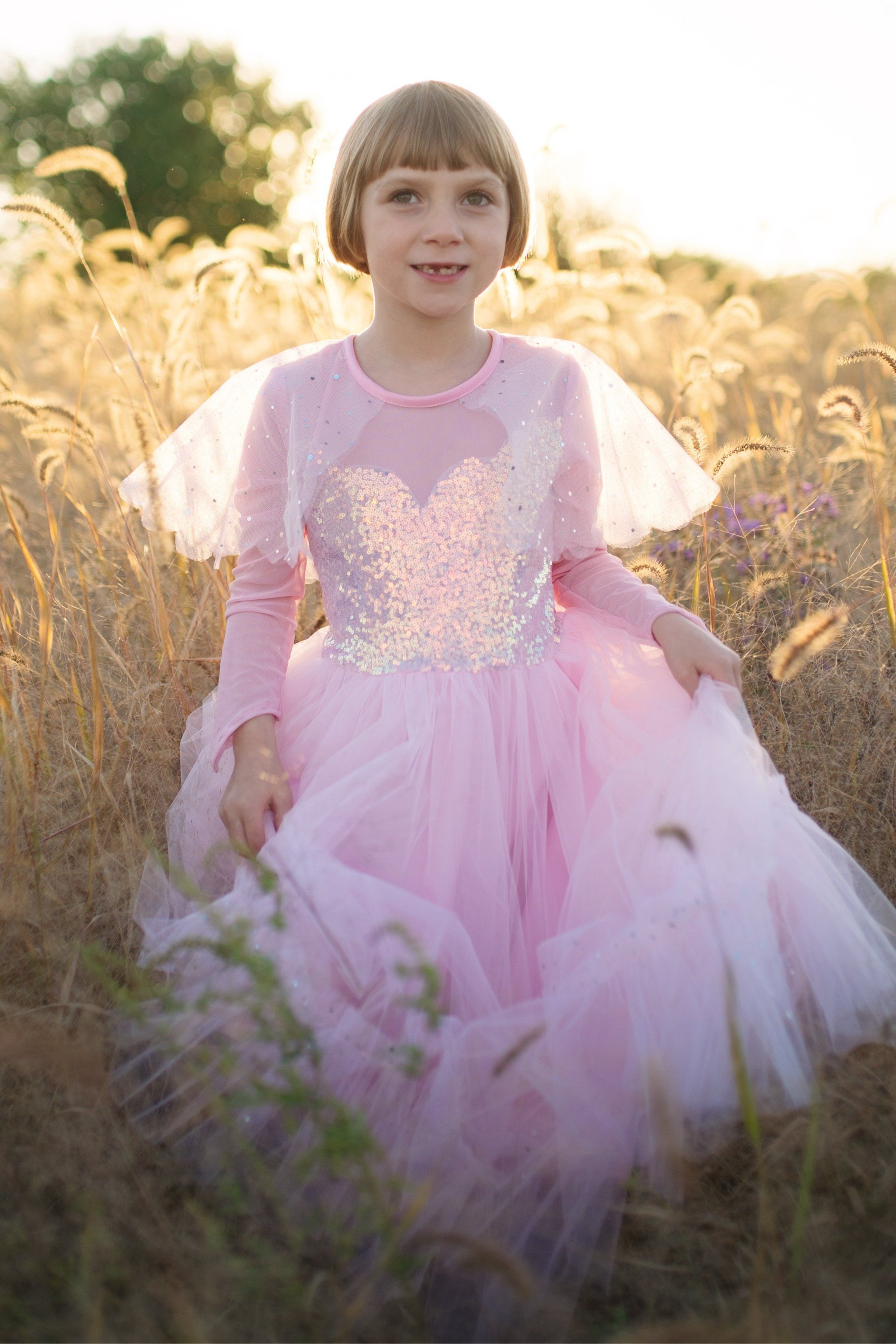 Elegant in Pink Princess Dress is a stunning design with a gorgeous sequinned bodice and illusion neckline (sweetheart neckline which is finished up to the neck with sheer and stretchy knit fabric) and satin trim. Attached to the neckline is a lovely sparkly capelet with scalloped finish, it’s made with pink mesh fabric showcasing printed holographic sequins. Elegant long sleeves are finished to a point. The skirt has a nice rich gathering of pink tulle finished with a ruffle made with the same holographic print as the capelet. The back of this dress has a Velcro closure and the elasticized waistband with a smocked waist (extra fabric gathering) provides even more comfort and size flexibility. Machine washable! This glamorous dress is sure to become your little one’s favourite childhood play costume!