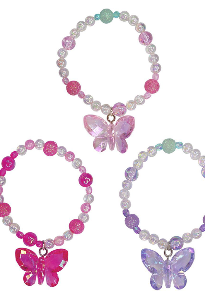 These fancy flutter bracelets come in 3 colour ways (pink, magenta, or purple) and compliment any beautiful butterfly! The multifaceted butterfly pendant is strung along side the iridescent clear beads as well as the fun glitter coated beads for a fun and fluttery look.