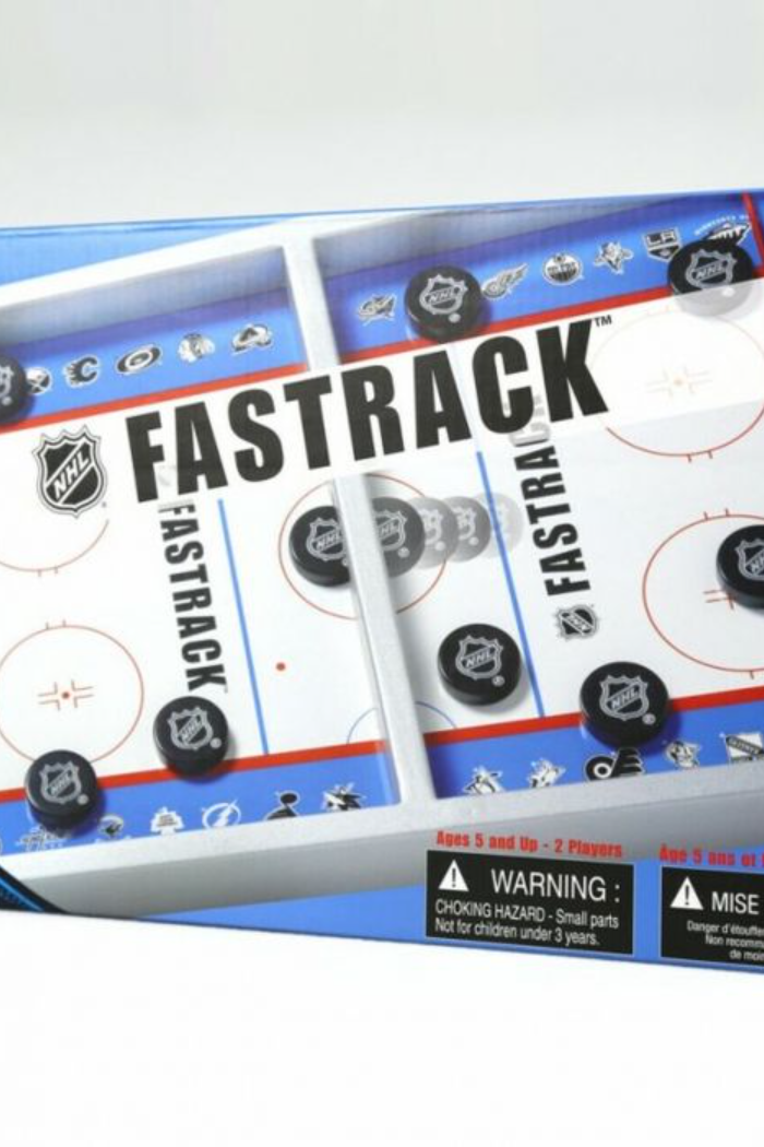 NHL Fastrack brings your favorite sport to your fingertips! Officially licensed by the National Hockey League, this puck passing game produces kinetic energy and exhilarating competition. The first to send all 10 pucks to an opponent`s side takes home the winning Cup! Just like a hockey game, NHL Fastrack calls for lightning-speed, accuracy and just the right amount of chance to win. The NHL branded wooden tray is detailed to replicate a real hockey rink, and the sidelines feature logos of teams adored by hockey fans all over North America.