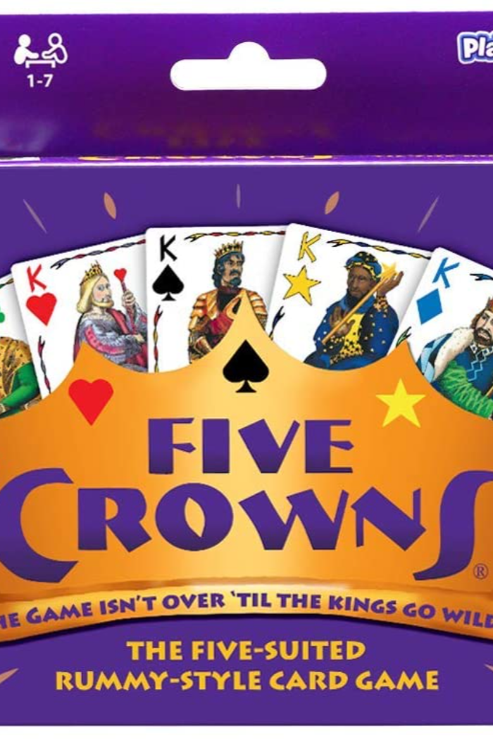 Five Crowns is a five suited rummy style card game. This award winning, classic game is a quick favorite for both avid and casual card players. Five Crowns features a unique double deck that contains 5 suits: spades, clubs, hearts, diamonds, and stars. This special deck makes it easier to arrange your entire hand into books and runs. The rotating wild card keeps players on their toes The game begins with 3 cards and 3s are wild, the next round has 4 cards and 4s are wild and so on ‘til the Kings Go Wild Make the right combinations, be the first to go out, then watch players scramble as they get one last chance to cut their losses Five Crowns is loved by everyone, easy to play anywhere and a game that you’ll want to play again and again.