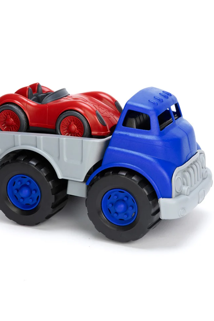 This sturdy blue truck hauls our sleek red hot rod on its back and has a flatbed that tilts up to allow the car to roll off. These eco-conscious vehicles are made in the USA from 100% recycled plastic milk containers that save energy and reduce greenhouse gas emissions. Product Specifications Product Dimensions: 10.5" L x 6.25" W x 6.25" H Product Weight: 1.43 lbs. Number of Parts: 2