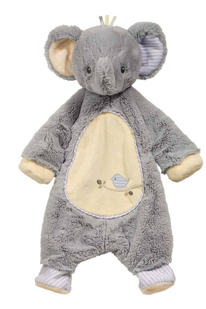 Age 0+ months. Elephant is 19". Machine washable ans exceed current safety standards.