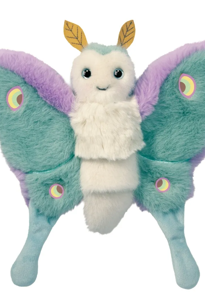 Boasting a whimsical design, Juniper the Luna Moth stuffed animal is the perfect guide to introduce wide eyed nature lovers to the wonders of the night! This cuddly friend captures all our favorite features of these fascinating nocturnal creatures. Leaf-like antennae combined with a soft fuzzy body are sure to charm you, while her generously sized swallowtail wings feature colorful, embroidered eye spots. A pocket in Juniper’s body allows her to transform into a playful finger puppet friend. Engage with Juniper’s cheerful smile and beautiful blue eyed expression for an evening of nighttime magic the two you will treasure for years to come!