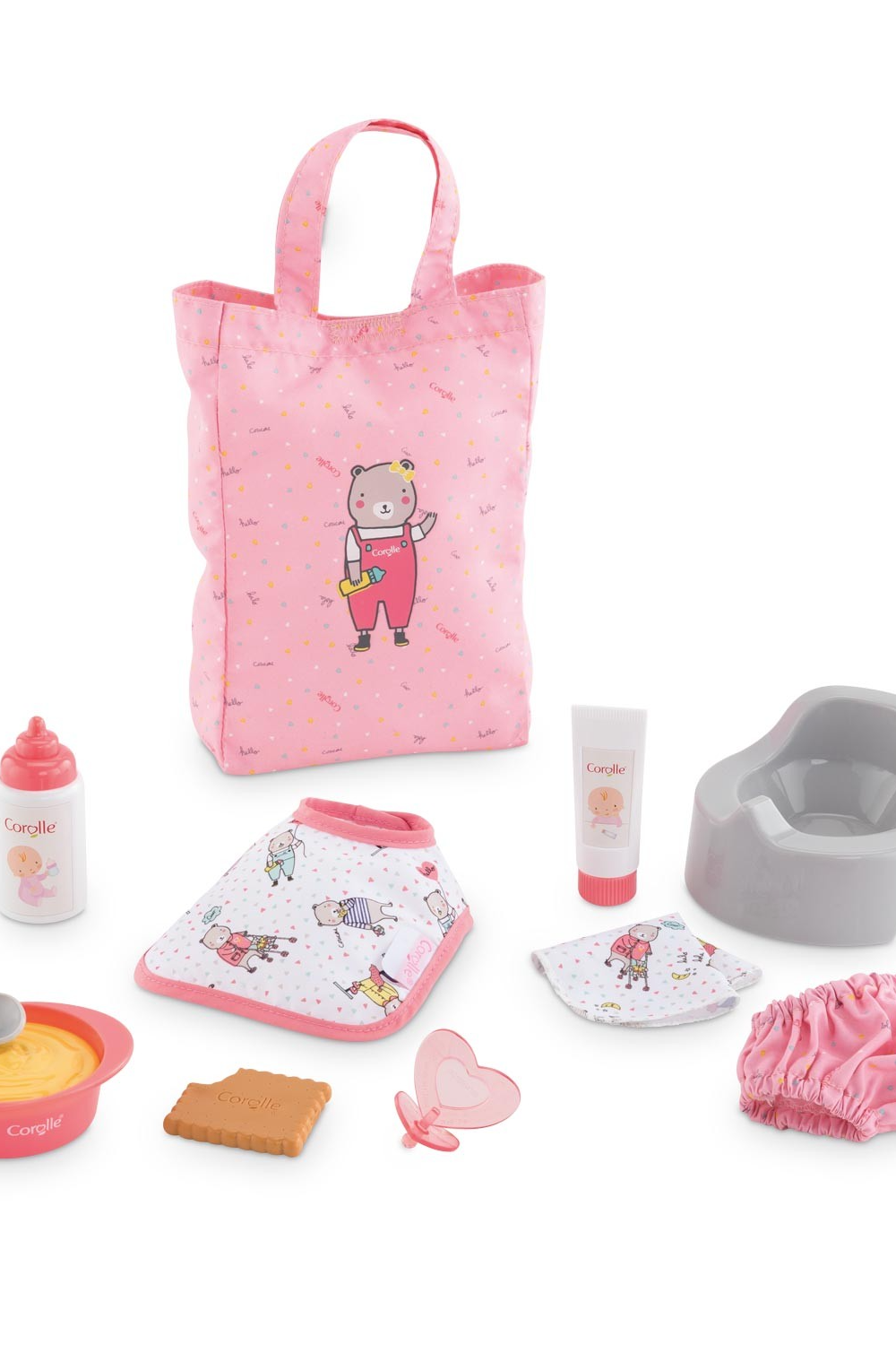 Age 18+ months. Large accessories set includes: 1 bottle, 1 pretend cookie, 1 bib, 1 feeding dish, 1 spoon, 1 potty, 1 tube of cream, 1 diaper, 1 baby wipe, 1 pacifier and 1 tote bag.