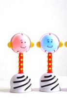 The NogginStik® developmental light-up rattle is baby’s first learning toy. It might look like a cute version of a baby rattle, but it has a powerful agenda. The NogginStik® was designed to help parents, caregivers and early intervention therapists begin encouraging early milestones in infants. The NogginStik head lights up red, blue and green to stimulate a baby’s eyes and to encourage visual tracking. The base of the NogginStik makes a soft rattle sound to please the ears. It has an easy to hold handle for mastering grasping and fun textures to delight the sense of touch. Your baby’s NogginStik® will help you begin to encourage her beginning milestones from the day she is born!