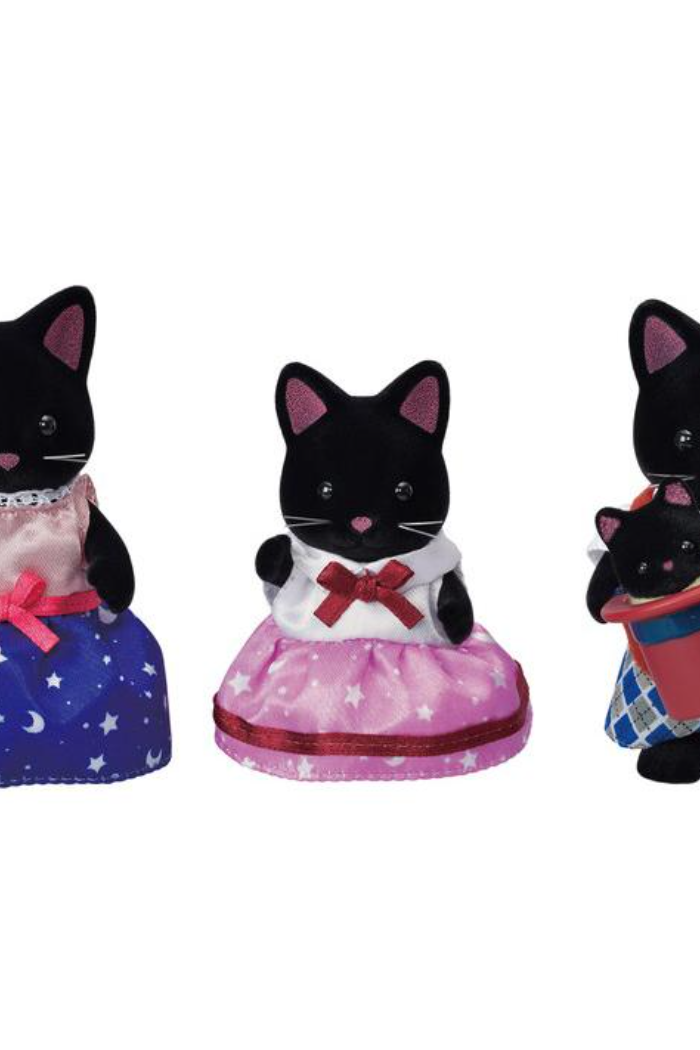 The Midnight Cat Family and their beautiful, black fur. Four piece set: The father who performs magic, the mother who can tell fortunes, the girl who loves to help everyone, and a free-spirited baby. The figures' heads, arms and legs can be moved, allowing them to pose a number of different ways. The father's silk hat can be used as a baby sling. Dressed in removable fabric clothing.