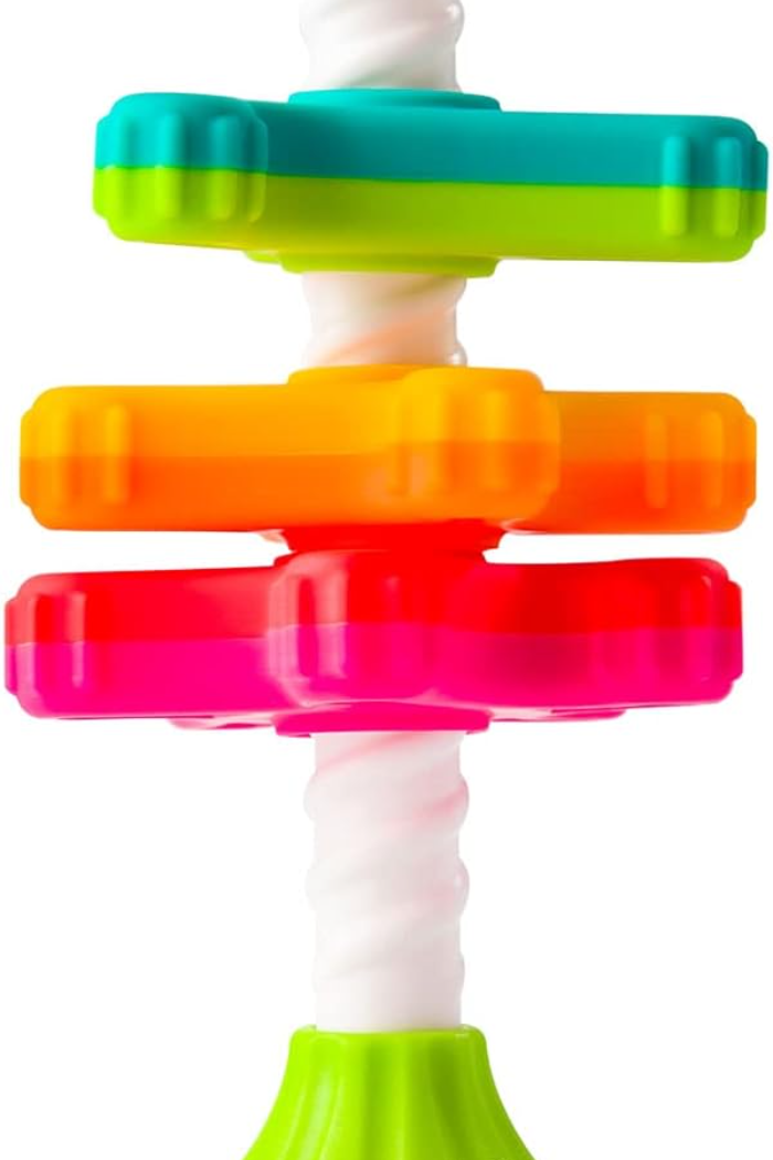This clever little toy is designed to stimulate toddler's senses while strengthening growing brains! Three brightly colored propellers spin up or down on a smooth corkscrew base, just keep flipping over and the fun never stops! Compact and lightweight, this toy features smooth, engaging pieces and is great for travel or tubtime! Ages 10mos.+; measures 3.2"x3.2"x8.2"