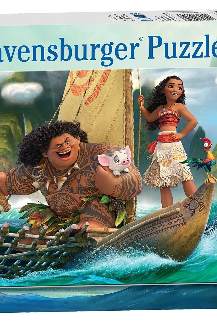 Moana, Maui, Hei Hei, and Pua have set sail for adventure! Puzzlers may join them in assembling this one hundred piece jigsaw puzzle with extra large pieces.