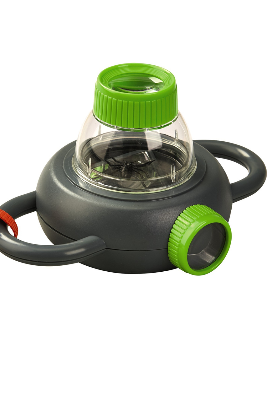 Age 5+ yrs. Magnifies 6X on top and 4X on bottom. Ingenious mirror makes it possible to explore objects from above and below. Includes 1 plastic spider.
