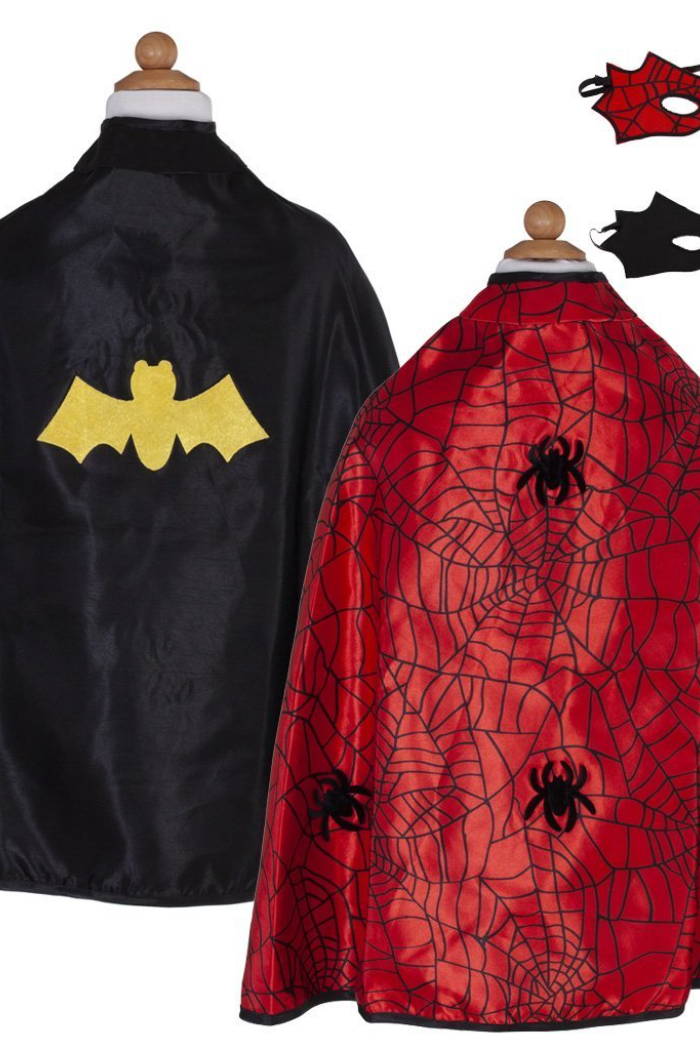 Our multi-award-winning design is perfect for little superheroes everywhere! This adorable reversible cape offers twice the fun with quality design and versatility. The black satin side feature a yellow bat emblem and reverses to a red spider web satin print on the reverse side with large black velour foam spider details. The Velcro closure at the neck makes switching superheroes a breeze.