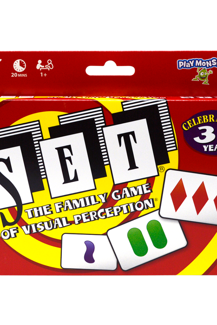 The award-winning game challenges players to race to find as many SETs as they can! A SET is three cards where each individual feature (color, shape, number and shading) is either all the same OR all different! The first player to see a SET calls out “SET” and grabs the cards—there are no “turns” and no luck here! And not only is it fast-paced fun, it also builds skills and exercises the brain! Because it has a rule of logic, and because players must apply this rule to the spatial array of patterns all at once, they must use both left brain and right brain thought processes! At the end of the game, the player with the most SETs wins! SET is prefect for a wide age range and number of players (including solo play!), and is a fun intergenerational game as well
