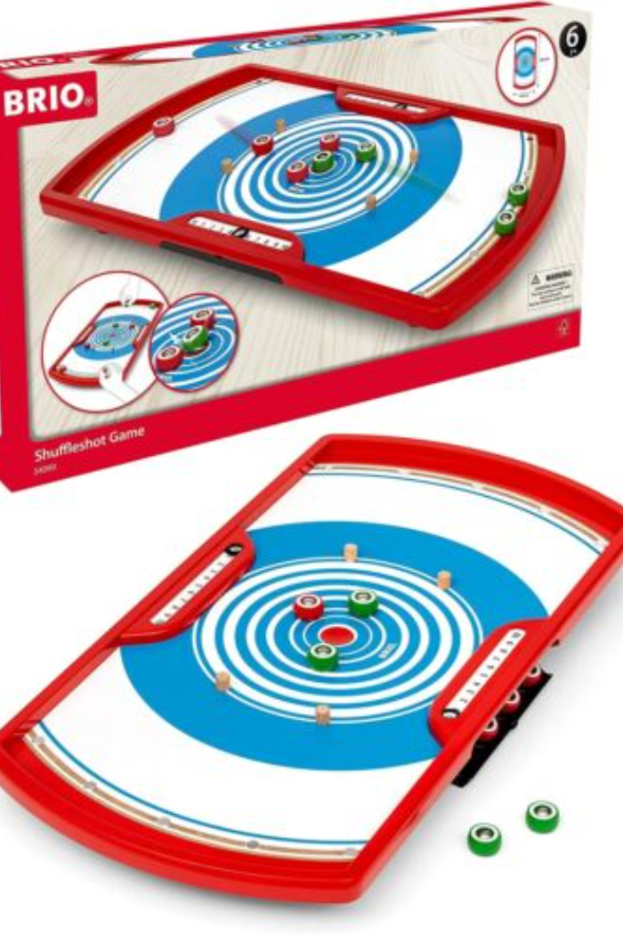 Will you build tactical barricades with well-placed discs or power through your opponents with the perfect slide? Either way, it’s the highest score that wins with the 34090 Shuffleshot Game. This strategic game offers a unique competitive experience for the entire family that takes inspiration from shuffleboard, curling and crokinole. The objective of the game is for players to score the most points by shooting their discs the closest they can to the centre point of the board. When all discs are shot, the player with the most discs closest to the centre wins!