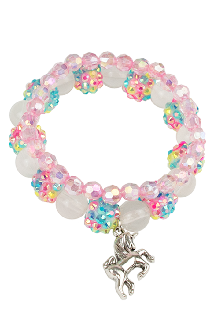 Our Sparkle Pony Bracelet set is just as it sounds! Made with rainbow crystal beads, translucent white beads & finished with a silver unicorn charm this set is sure to be eye catching! Pair it with its matching translucent pink bracelet to complete the look! Our children's jewelry is strung with double the elastic to add extra durability.