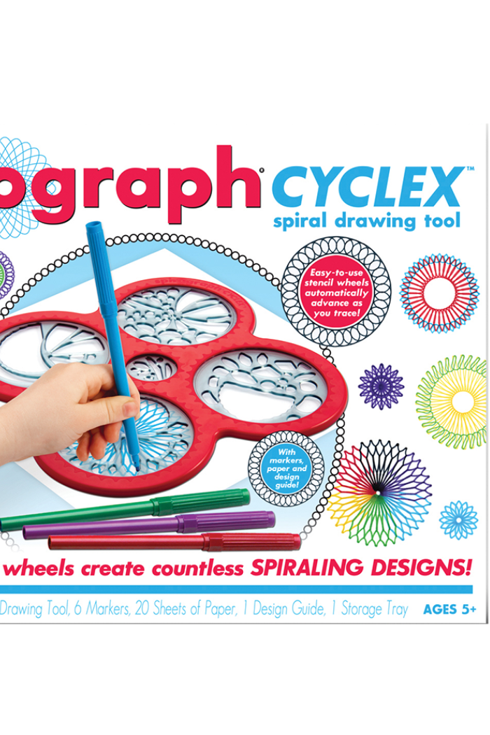 The amazing Spirograph Cyclex drawing tool makes it simple for kids of all ages to create intricate and beautiful spiral art designs and patterns. The unique rotating stencil wheels of the Cyclex automatically advance as you trace making it easy and fun to create incredible detailed designs. The design wheels are fully encased inside the Cyclex, which prevents accidental slipping of the gears, making it perfect for younger artists. Works with the included design markers as well as with your own pens, markers and crayons.