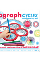 Contents: Spirograph® Cyclex™ Drawing Tool, with over 80 different stencil design options, 6 Art Markers, Storage Tray, Design Guide, 20 Sheets of Design Paper