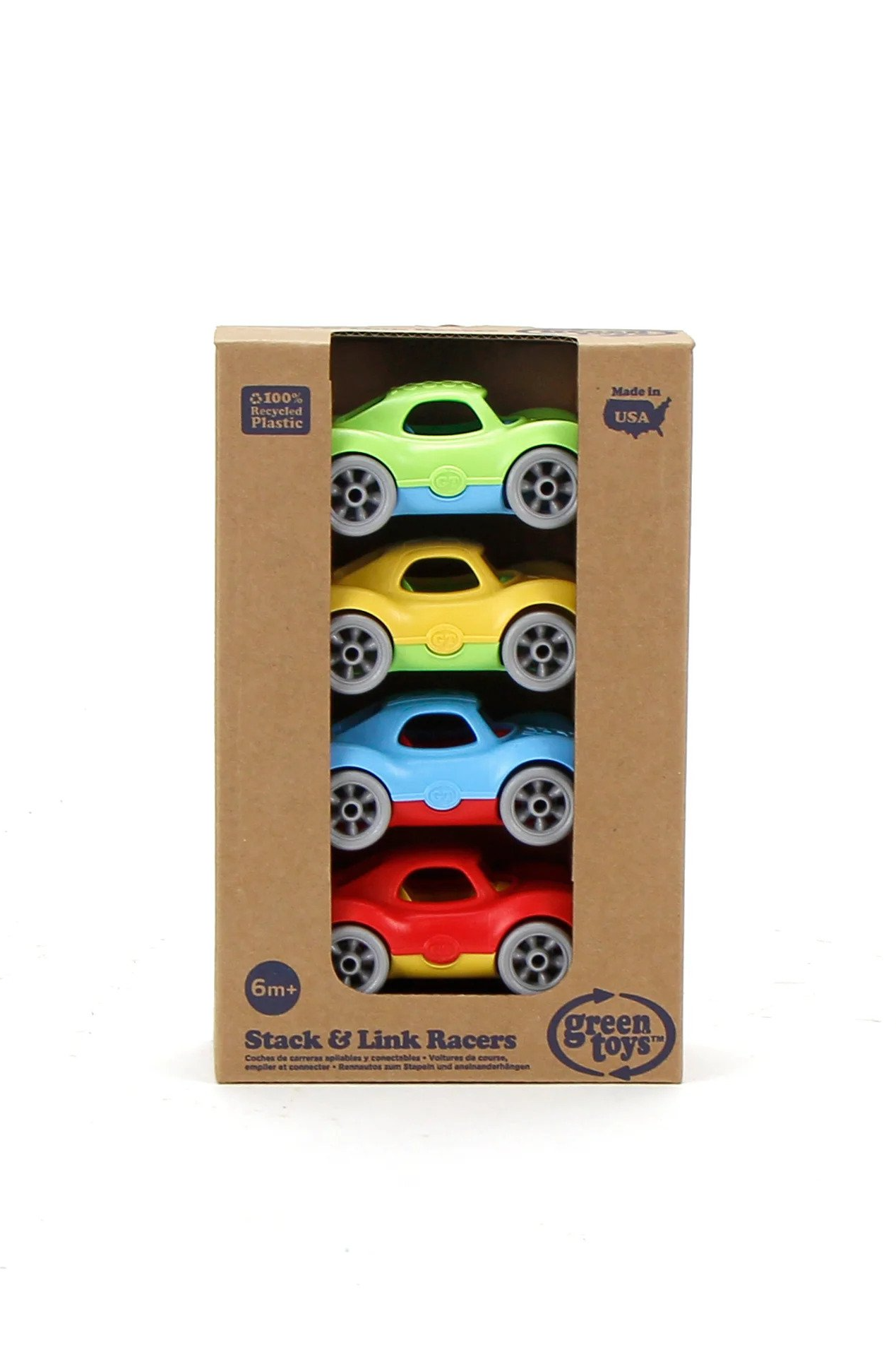 Start your engines! The Green™ Stack & Link Racers are ready to roll! These pocket-sized cars are the perfect size babies and toddlers, but are filled with fun for any age. The unique design allows for the cars to be used individually, linked together in a chain, or stacked up to form a tower. Each pint-sized car sports unique texture detailing for tactile stimulation, while the whole fleet features a super-eco design with no metal axles or external coatings.