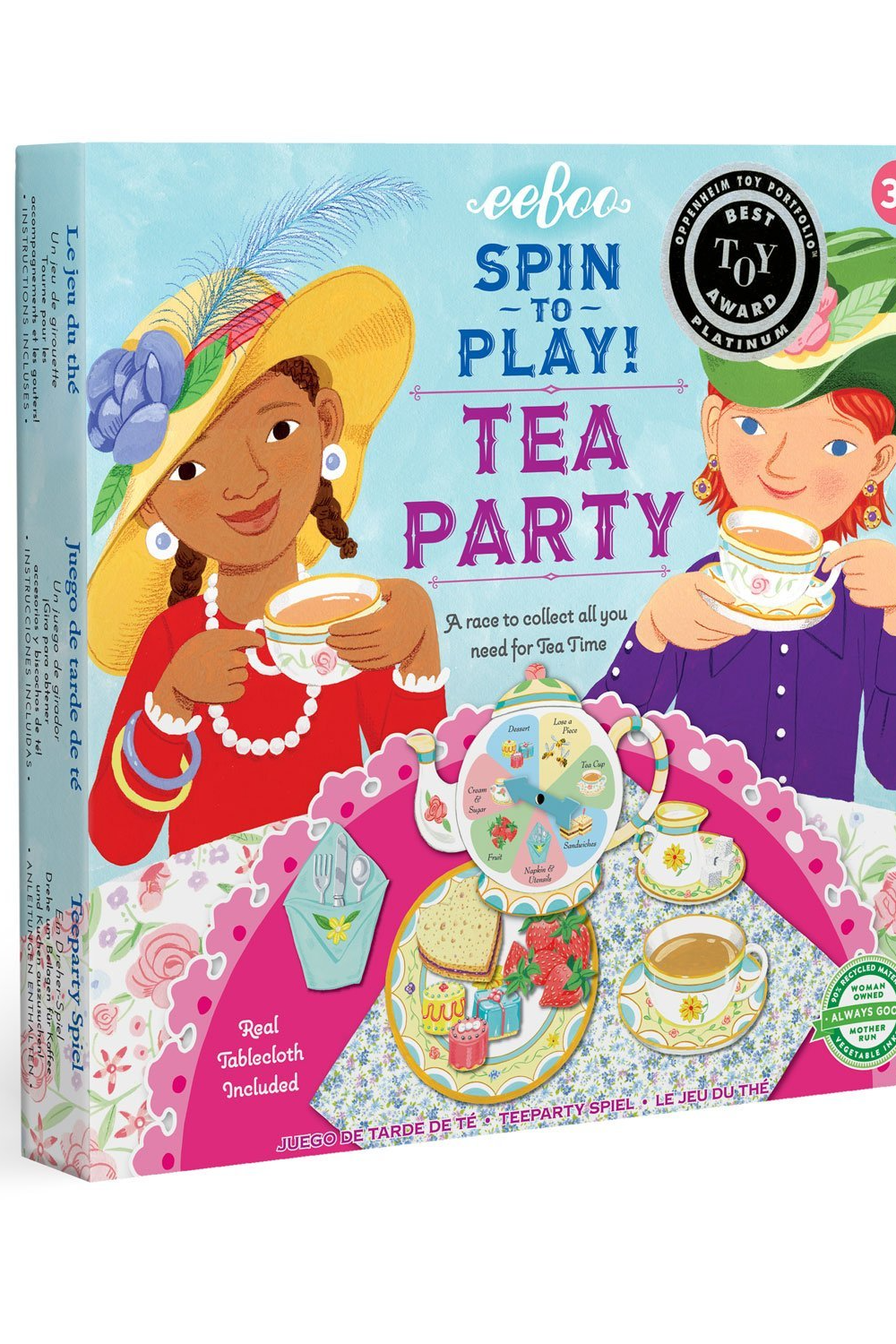 Tea Party Spin-to-Play game helps young children practice patience and social skills. Spready the real fabric tablecloth, ready the teapot spinner and spin to choose for tea, sandwiches, fruits, desserts, cream and sugar, napkins and utensils. The first guest to collect an item from every category wins the game, but everyone will enjoy choosing among the tempting party goodies. All food pieces, plates and spinner are made of sturdy cardboard material and printed with vegetable inks. A colorful 20” x 20” tablecloth is also included.
