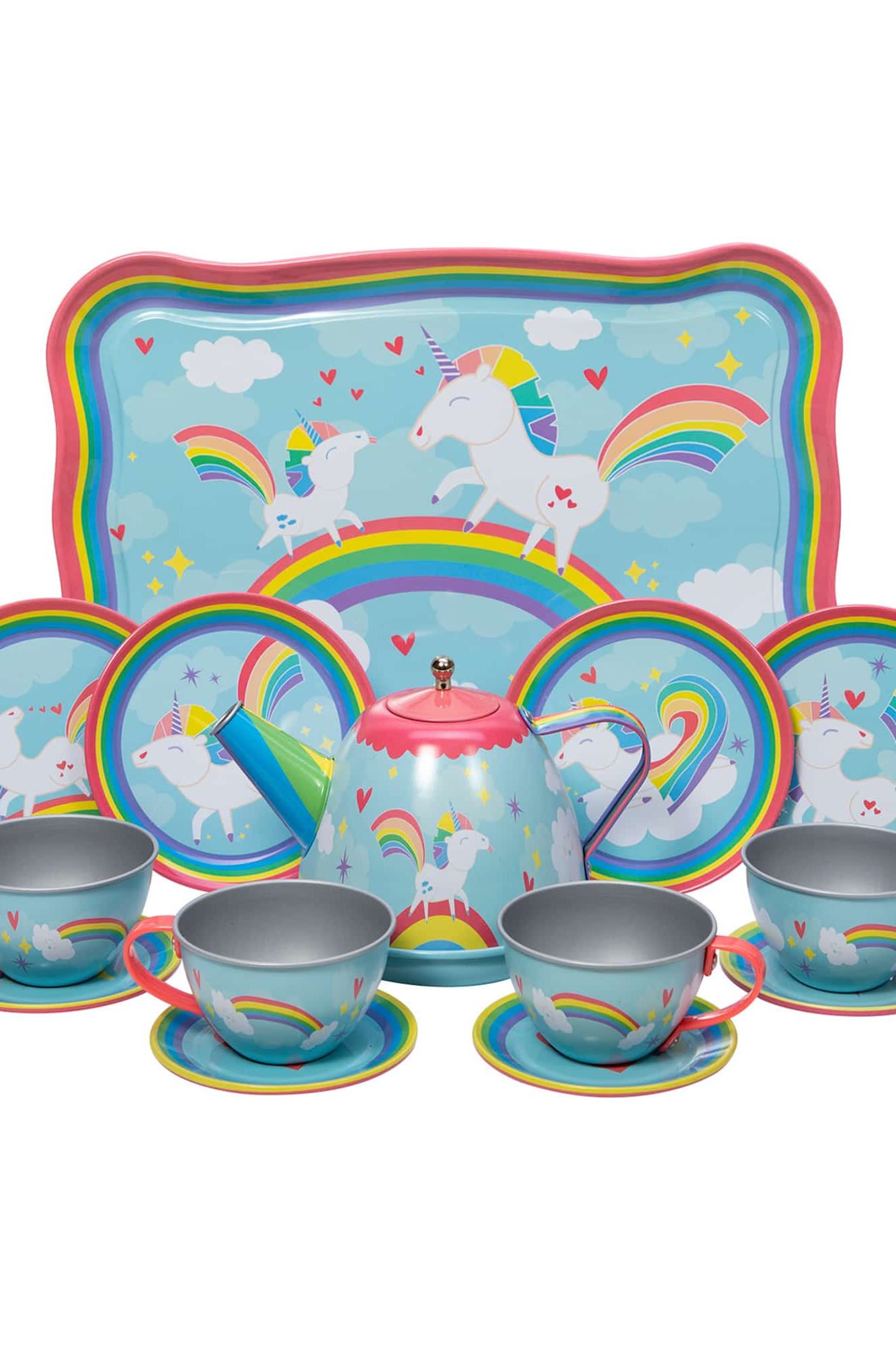 A beautiful 15 piece tin tea set featuring everyone’s favorite fantasy creature, all wonderfully decorated with whimsical unicorns and rainbows