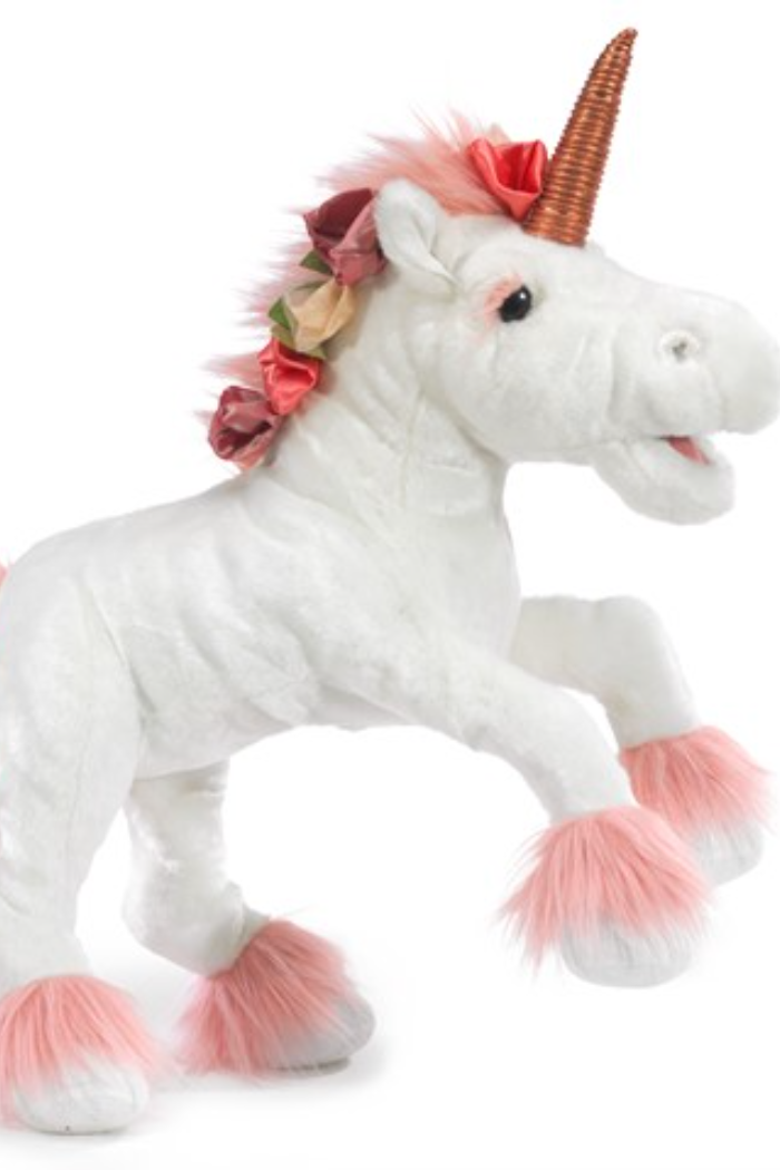 Beguiling in its beauty, the mythical Unicorn comes to life as a Folkmanis® Puppet. This graceful white creature has a metallic rose-gold spiraled horn, lovely long eyelashes and a flowing pink mane and tail adorned with floral accents. Animate mouth and wind the tail to activate the music box and hear her enchanting melody.