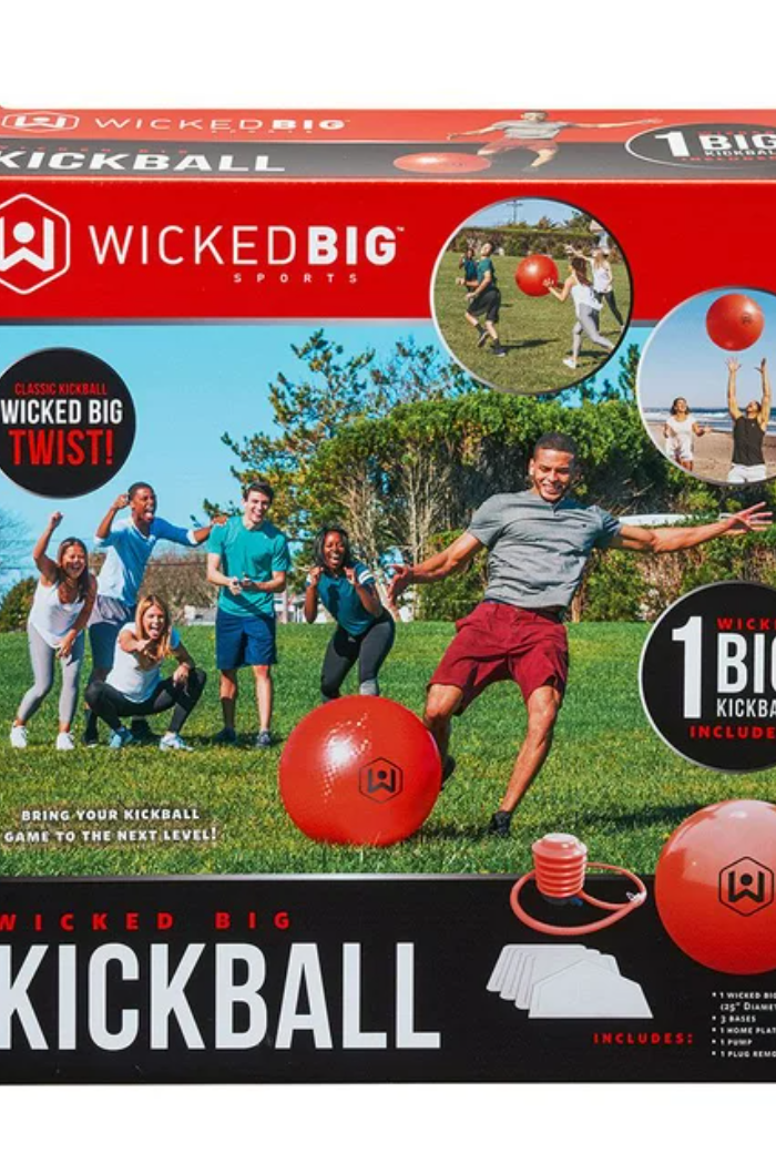 Get ready to play the classic game of kick ball with a wicked big twist! You'll have everything you need to start a game including 3 bases, a home plate, and a pump to blow up the enormous 25" diameter red rubber ball. 3 ball plugs and a plug remover also included. A wicked good time for all ages!